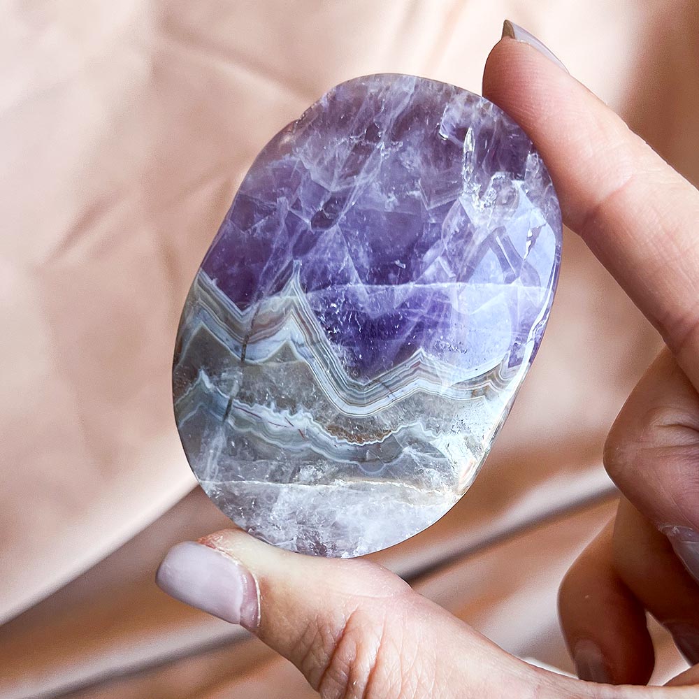 As Palmstones de Ametista com Ágata unem duas energias poderosas num só cristal: a serenidade espiritual da Ametista e a estabilidade protetora da Ágata. São peças únicas e polidas, perfeitas para segurar na palma da mão, meditar ou usar em terapias energéticas.