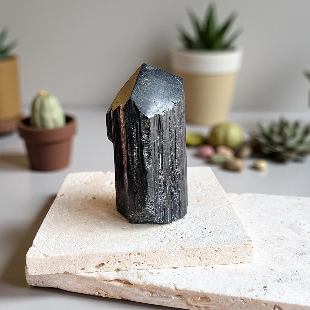 Esta é uma peça extraordinária de Turmalina Negra em bruto, que foi semi polida na base e também na ponta. Perfeita para colocares na entrada da tua casa.
