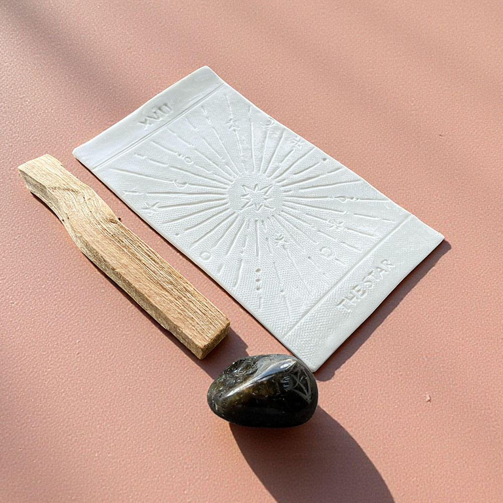 A imagem da carta XVII representa a renovação espiritual e a força da fé em tempos de mudança. Esta peça transforma o teu altar ou espaço de defumação num convite à contemplação interior.